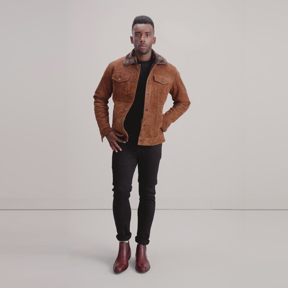 Indulge in the ultimate warmth of our Shearling Trucker Jacket. Weighing just 0.5kg, it provides the perfect balance between functionality and comfort. The faux fur lining ensures you stay snug on the chilliest days, while the real goatskin leather exterior offers a suede finish that’s soft to the touch.