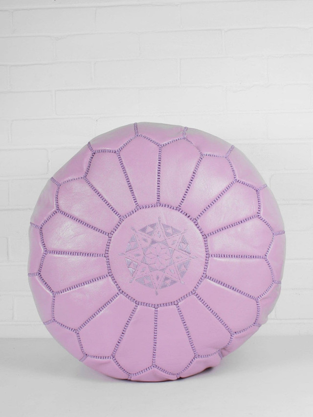 Lilac Embroidered Hand made Moroccan leather pouf .These wonderful genuine leather poufs are handmade by skillful artisans in the Marrakech souk market and they are made of great quality genuine leather.A Moroccan staple that creates a low seating option that makes for a warm and cozy atmosphere, This Moroccan pouf also adds a specail touch to any room. They have a zipper throughout the bottom so you can easily fill the poufs with polyester material you would usually use to stuff pillows.