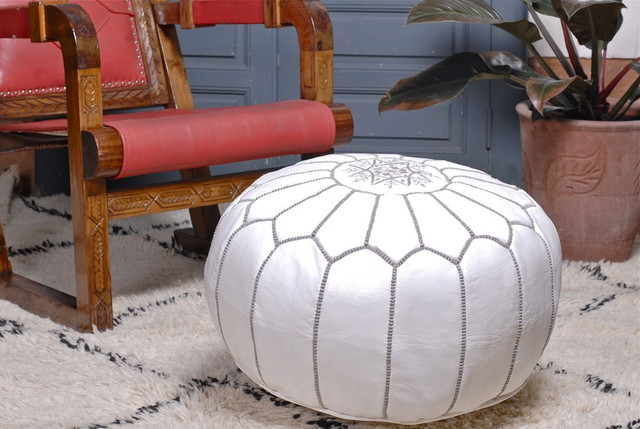White flower Embroidery Hand made Moroccan leather pouf .These wonderful genuine leather poufs are handmade by skillful artisans in the Marrakech souk market and they are made of great quality genuine leather.A Moroccan staple that creates a low seating option that makes for a warm and cozy atmosphere, This Moroccan pouf also adds a specail touch to any room. They have a zipper throughout the bottom so you can easily fill the poufs with polyester material you would usually use to stuff pillows.