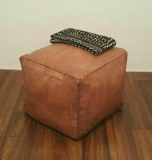 Light tan square Hand made Moroccan leather pouf .These wonderful genuine leather poufs are handmade by skillful artisans in the Marrakech souk market and they are made of great quality genuine leather.A Moroccan staple that creates a low seating option that makes for a warm and cozy atmosphere, This Moroccan pouf also adds a specail touch to any room. They have a zipper throughout the bottom so you can easily fill the poufs with polyester material you would usually use to stuff pillows.