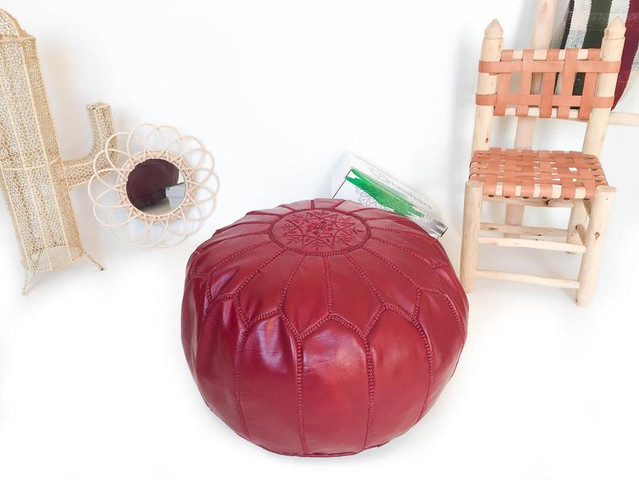Cherry red Embroidered Hand made Moroccan leather pouf .These wonderful genuine leather poufs are handmade by skillful artisans in the Marrakech souk market and they are made of great quality genuine leather.A Moroccan staple that creates a low seating option that makes for a warm and cozy atmosphere, This Moroccan pouf also adds a specail touch to any room. They have a zipper throughout the bottom so you can easily fill the poufs with polyester material you would usually use to stuff pillows.