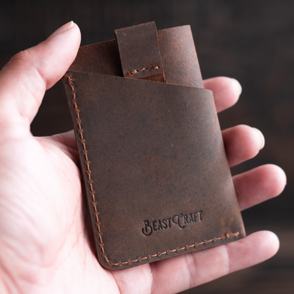 Hybrid Design. \nCard Holder cum Wallet.\nVertical wallet.\n100% leather, no lining.\n1 top insert slot with pullout strap.\n2 large card slots.\nTop quality genuine Leather.\nSimple minimalist top insert design with a 2 card slots and 1 top slot for folded bills. Can hold multiple cards per slot. Pull out strap to easily take out cards or cash from top slot.\nMaterials\n4 0z (1.6 mm) thick hand waxed genuine leather.\nHigh quality Japanese nylon thread.\nSpace\n2 Card slots. (each card slot is large enough to hold multiple cards)\n1 Cash slot. (For folded bills)\nDimensions \nHeight – 4″\nLength – 2.5″\nCall/ Whatsapp: +91 90412 20044\nEmail: contact@beastcraft.in